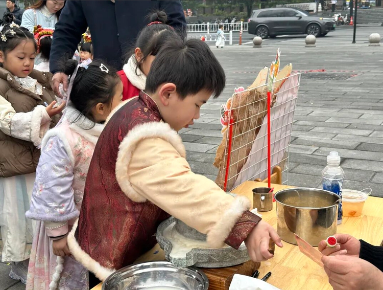 迎新年,笑开颜,软软糯糯的豆腐显得非常有烟火气,孩子们玩转磨豆腐,用笑脸喜迎新年。