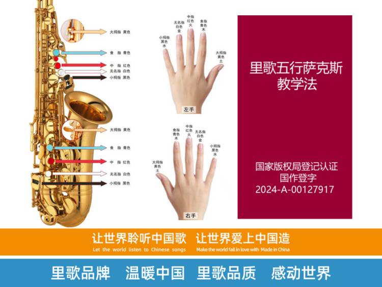 截至目前,里歌先生已累计取得多项萨克斯专利与著作权,彰显深厚专业功底与持续创新能力。里歌五行萨克斯教学法的核心优势是“简单实用、高效易懂”,打破传统教学壁垒:它将萨克斯上下按键按五行划分为“金、木、水、火、土”五个区域,上半部为“左手明区”(左手五指操控),下半部为“右手暗区”(右手五指操控);并依据五行与五指(大拇指至小拇指对应土、木、火、金、水)、五色(黄、青、红、白、黑)的关联,为每个按键区域做清晰标注。学习者通过“手指五行+按键颜色”联动记忆,即可快速掌握演奏技巧,轻松入门。