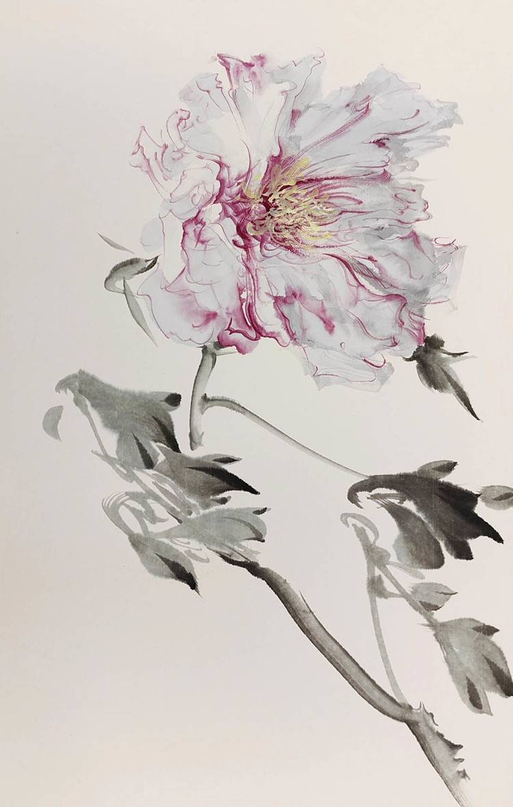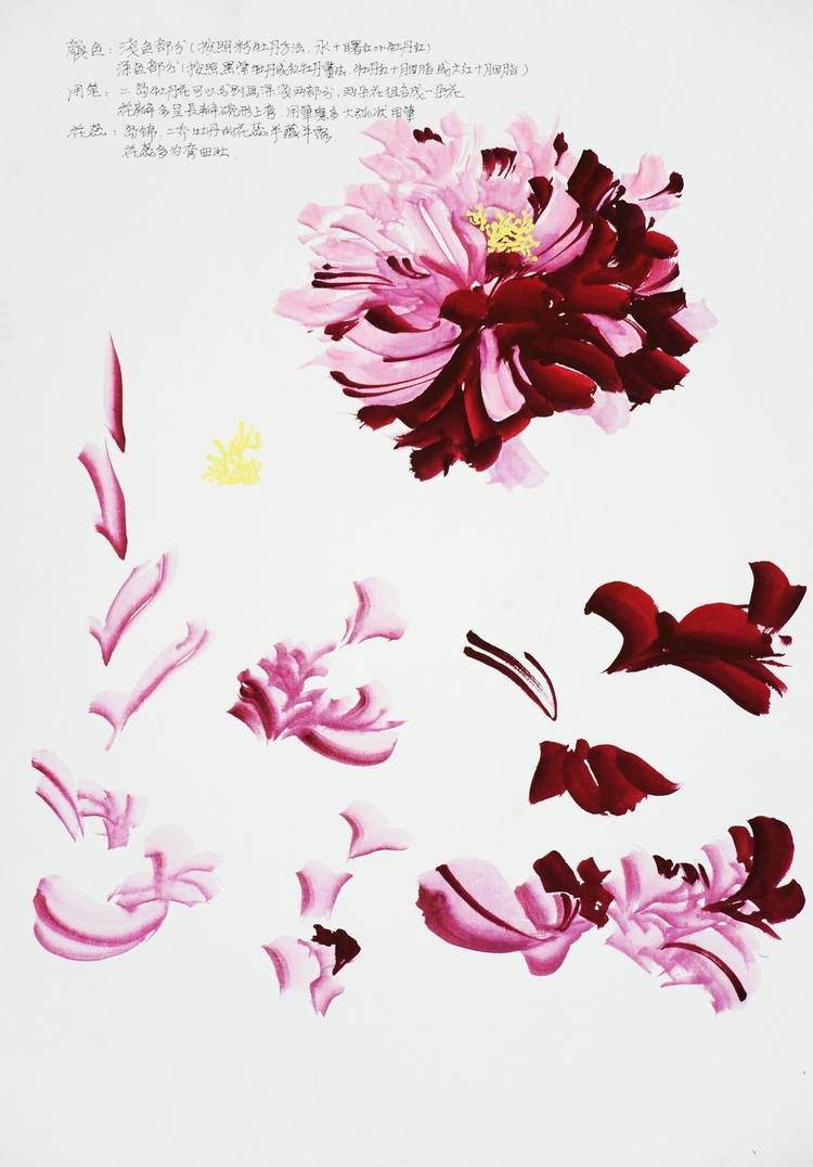 9.为了表现不同品种花瓣的不同特点,用笔方法也应该有所调整,在写生中,针对不同花瓣,散锋适合画花瓣零碎的牡丹、扁锋适合画绣球型那种繁密花瓣的牡丹,对于花瓣大小穿插比较丰富的,适合行草书的笔法。
