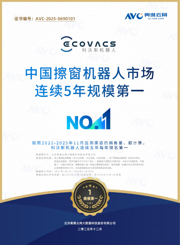 与此同时,奥维云网(AVC)的监测数据进一步佐证了科沃斯在中国大本营的深厚根基——按照2021年至2025年11月的全渠道销量及销额计算,科沃斯已连续五年蝉联中国擦窗机器人市场规模第一。