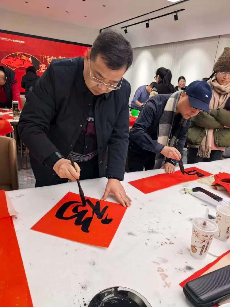 活动现场,翰墨飘香,暖意融融。民进杭州市委会专职副主委兼秘书长杭州民进开明画院院长陈月利,民进市委会常委、萧山区委会主委朱亚利,民进杭州市委会社会服务处处长林宏民进市委会委员、杭州民进开明画院副院长兼秘书长黄莘祥杭州民进开明画院副院长萧鸣金薇冬,上城民进开明画院院长俞富根,上城民进开明画院常务副院长赵茂祥,马可波罗·开明艺术院院长魏军苗亲临现场,与居民们共迎新春、共话文脉。杭州民进开明画院的书法家们凝神聚力,饱蘸浓墨,在大红宣纸上挥毫泼墨。笔锋流转间,一幅幅对仗工整、寓意吉祥的春联跃然纸上,“策马奔腾开锦绣,扬帆起航创辉煌”等联句既贴合丙午马年“锐意进取、奋勇争先”的精神内核,又承载着对新一年国泰民安、生活美满的美好期许;一个个遒劲有力的“福”字,或端庄大气,或灵动洒脱,将最质朴的新春祝福凝于笔端,成为四季更迭中温暖人心的精神力量。墨香与年味在空气中交织,欢声笑语此起彼伏,构成了一幅“民有所乐、艺有所为”的和谐图景。