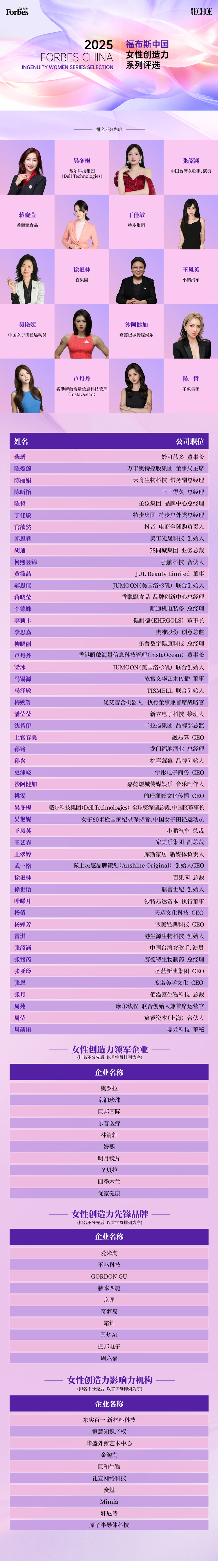 “2025福布斯中国女性创造力系列评选”完整评选结果如下(排名不分先后):