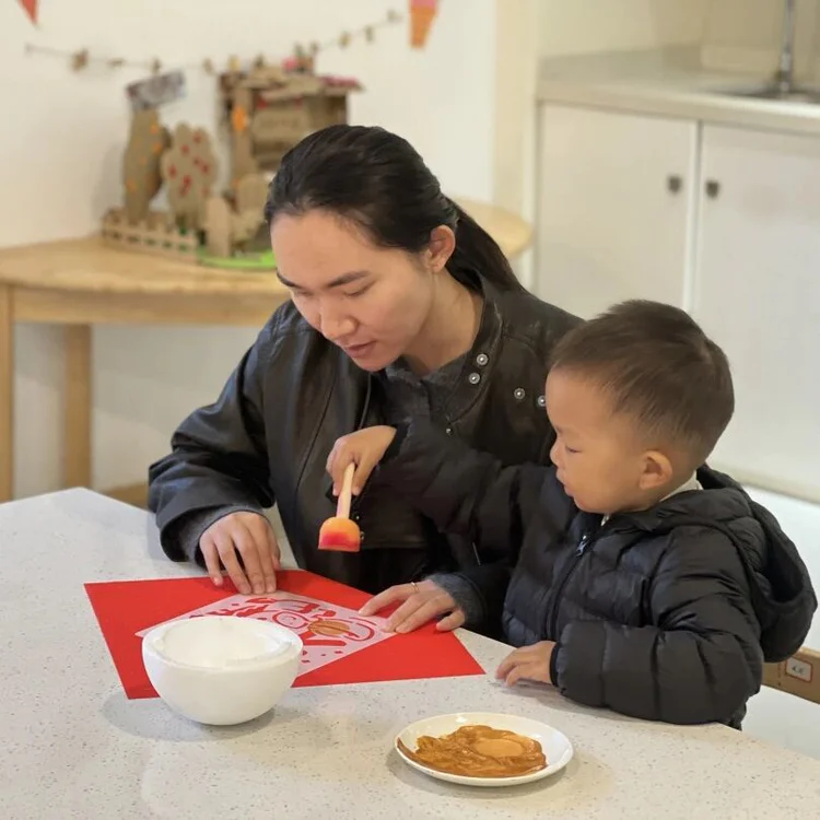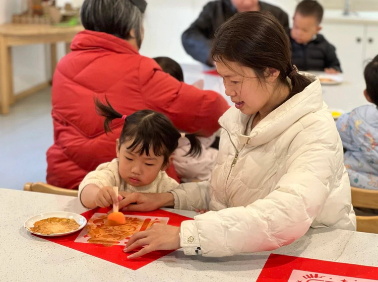 红纸上的福字轮廓静静等待着萌娃的创作。黄老师带着宝贝们拿起拓印工具,蘸上金黄的颜料,在镂空的福字模板上轻轻拍打。当色彩一点点晕开,憨态可掬的小马图案和喜庆的福字逐渐清晰,祖孙搭档、亲子协作的画面里,满是暖暖的年味与亲情。