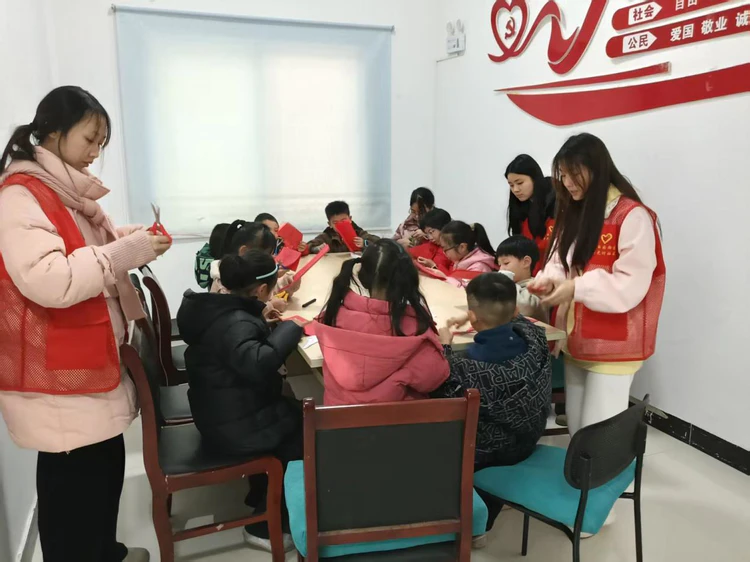 开班当天,一场“剪窗花·迎新春”非遗体验课率先开课。志愿者老师先为孩子们讲解了剪纸的起源与吉祥图案的文化寓意,随后带领大家动手实践。在志愿者的手把手指导下,孩子们手持红纸与剪刀,认真折叠、裁剪,一只只灵动的小兔子、一幅幅喜庆的福字窗花在指尖诞生。孩子们兴奋地展示着自己的作品,活动室里充满了欢声笑语与浓浓的年味儿。