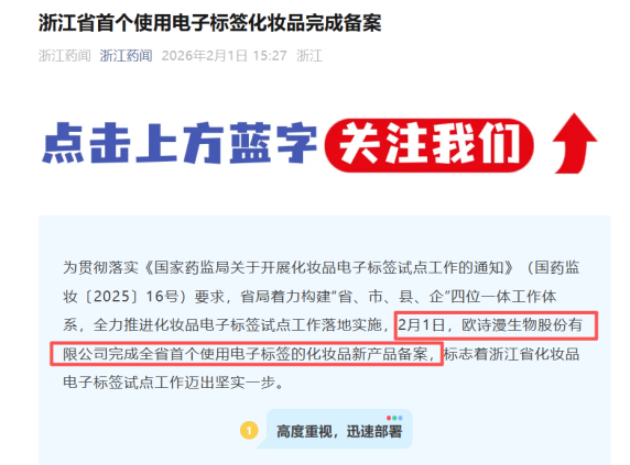 2026年2月1日,国家化妆品电子标签试点政策正式落地实施。就在这历史性的同一天,国民美妆品牌欧诗漫率先交出首份答卷,成为浙江省首家完成电子标签备案的化妆品企业。