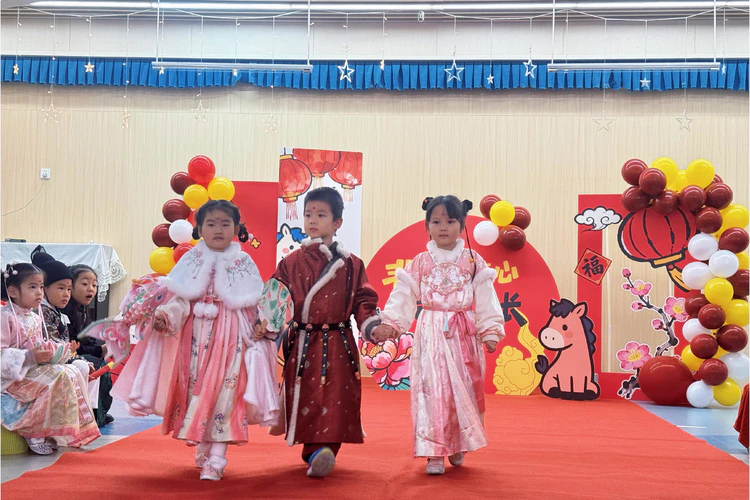 传统服饰走秀环节同样精彩,宛如一场流动的“古风美学展”。萌娃们身着飘逸汉服、喜庆唐装、雅致新中式等传统服饰,搭配花钿、发带等配饰,化身为灵动可爱的“小古人”。小班萌娃集体登台,挥手比心萌动全场;中班幼儿分组亮相,自信介绍服饰特色;大班孩子则气场十足,单人走秀定格帅气造型。最后,各班老师携幼儿共同登台,师生同框的温馨场景将活动推向高潮,也让孩子们在直观感受服饰之美的同时,进一步增强对传统文化的认同与自豪。