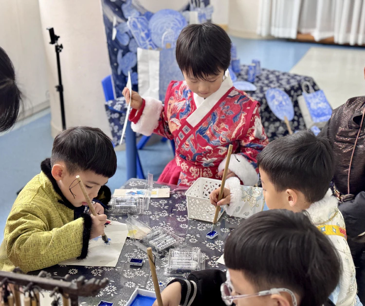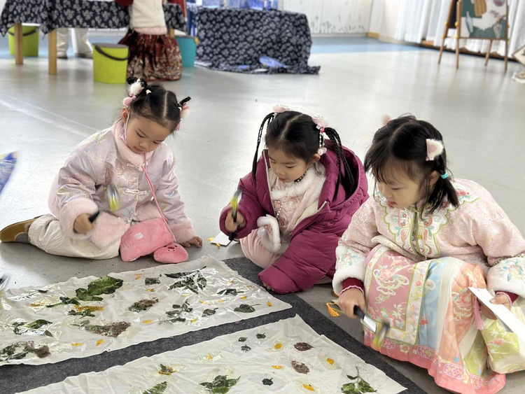 非遗集市作为本次活动的亮点,共汇集9项经典非遗项目,涵盖传统工艺、特色美食和互动体验三大板块。11个班级化身特色摊位,共同营造出热闹非凡的“非遗小江湖”。在老师和家长志愿者的引导下,孩子们亲手尝试汝窑冰裂纹制作、漆扇DIY、蓝晒工艺等非遗项目——用海绵压印纹路、在水面创作扇面、以花叶拓印图案……每一项体验都充满趣味与探索,孩子们在专注实践中,真切感受到传统工艺的温度与智慧。集市还特别设置了自主交易环节,大班幼儿使用纸币、中小班幼儿手持硬币,在摊位前自主挑选喜爱的作品。孩子们不仅体验到“购物”的乐趣,还在实践中认识钱币、学习使用,悄然锻炼了社交能力与规则意识。