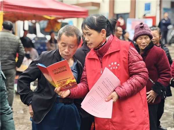 台上好戏连台,台下服务暖心。身着红马甲的志愿者们穿梭在人群中,一边引导观众有序就座、维持现场秩序,一边利用演出间隙开展政策宣传。他们手持宣传单,用通俗易懂的乡音向群众讲解移风易俗、交通安全、防诈骗等知识,将文明新风吹进百姓心坎里。