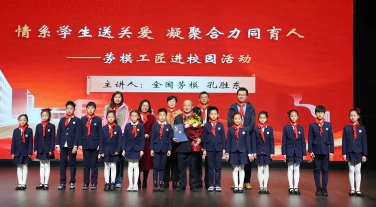 3 月 5 日是第 63 个学雷锋纪念日。区总工会、区教育局联合邀请全国劳模孔胜东来到大关小学教育集团开学典礼现场,弘扬劳动精神、劳模精神、工匠精神。拱墅区总工会副主席毛雪梅为孔胜东颁发校外辅导员聘书。退休前,作为杭州 28 路公交车司机,在岗期间孔胜东安全行驶零事故。同时,长期坚持公益事业,四十年来每个周六晚上坚持免费为市民修车,风雨无阻。他用质朴的语言分享坚守与奉献的故事,给孩子们带来了别开生面的开学第一课,让劳模精神在孩子们心中落地生根。