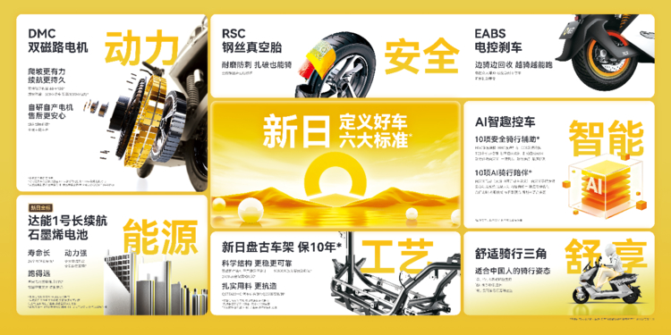 标准之上方见匠心,品质之内方得人心。新国标落地后,新日不仅积极响应合规要求,更立足用户全场景出行需求,创新性提出好车六大标准:动力、能源、安全、工艺、智能、舒享,从底层逻辑重构行业品质标尺。DMC双磁路电机解决爬坡动力痛点,RSC钢丝真空胎实现“扎破仍可骑行”,AI智趣控车系统全程筑牢出行防线,以严苛自我要求领跑行业标准。