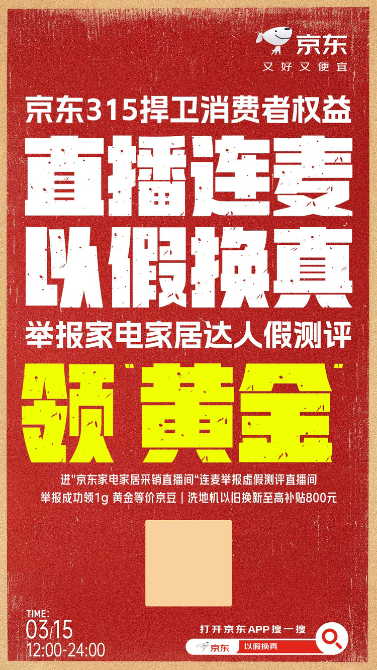 同时,京东也将治理动作进一步延伸到消费者权益保障层面。3月15日当天,如用户发现虚假测评行为,或曾遭遇虚假测评误导,可上京东搜索“以假换真”,申请在直播间连麦,提供相关虚假测评达人姓名及详细线索;经核实有效后,京东采销会向线索提供者奖励价值1克黄金的京豆。同时,京东用至高800元的大额以旧换新补贴,降低消费者的换新成本。
