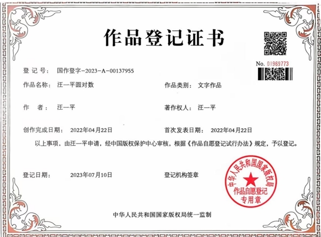 2023 年获得国家知识产权局批准《作品登记证书》。获得中国人工智能学会 2011 年一个 “一等奖”,2022-2023-2024 年三个 “特等奖”。这样一来,圆对数具有独立、自主、创新特征,建立了中国特色的新数学 - 人工智能基础理论。