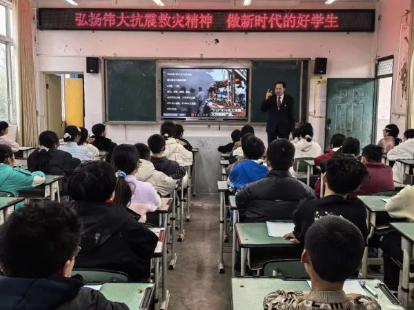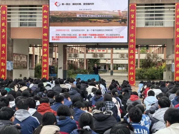 3月19日,梓潼县文昌中学运动场,绵阳市抗震救灾精神宣讲团景富国老师给初一全体学生上了一堂特殊的思政教育课。他通过展示的实景照片、真实数据,还原了17年前汶川特大地震震撼场景和抗震救灾艰辛历程,人民子弟兵冲锋在前、医护人员救死扶伤、志愿者无私奉献等感人故事让学生们为之动容;教育学生们要担当起他们这一代的使命,把个人的成长融入到中华民族伟大复兴的“中国梦”去,把无私奉献和顽强不屈的精神传递下去,以实际行动为校争光、为祖国成才!