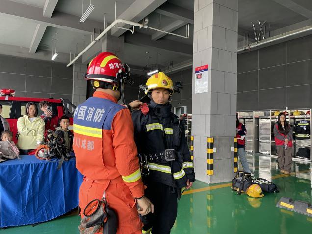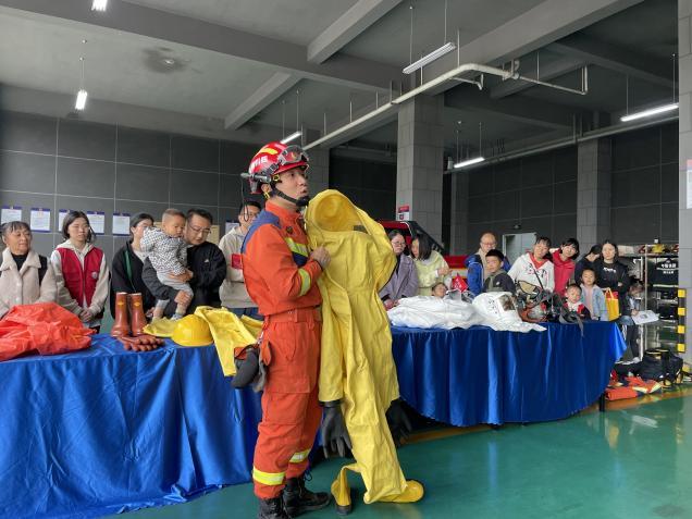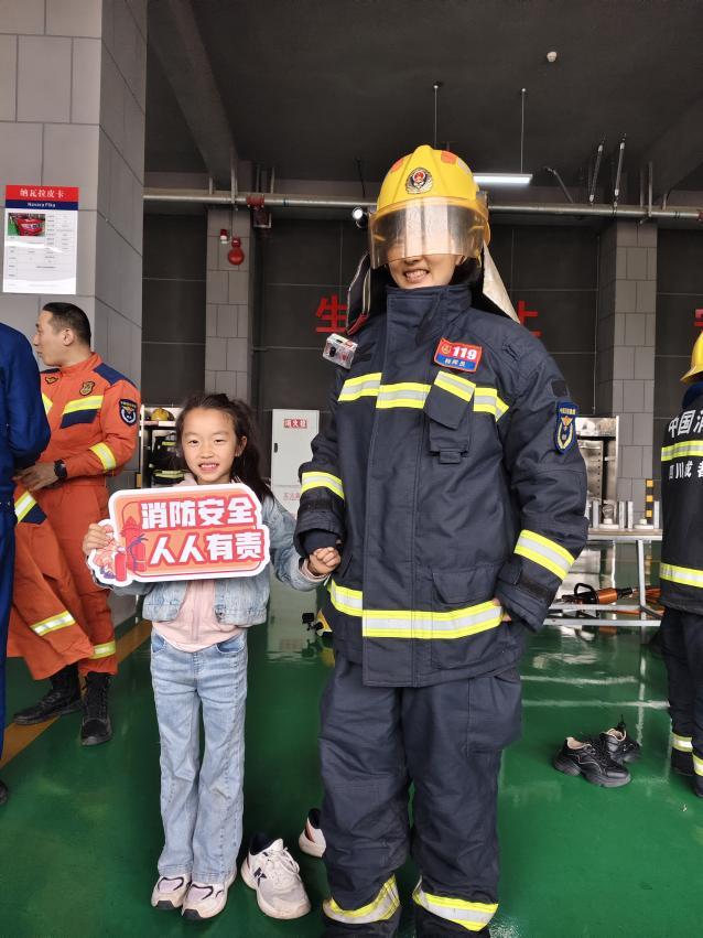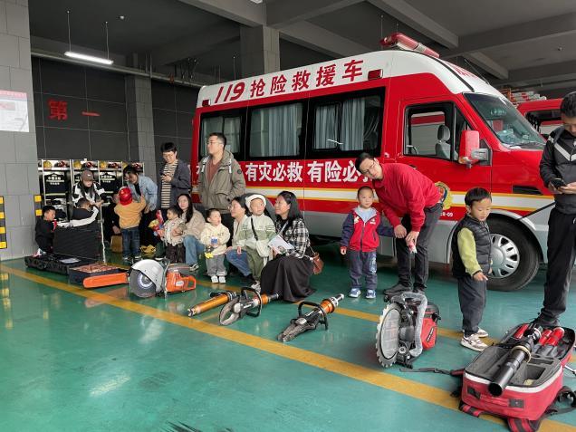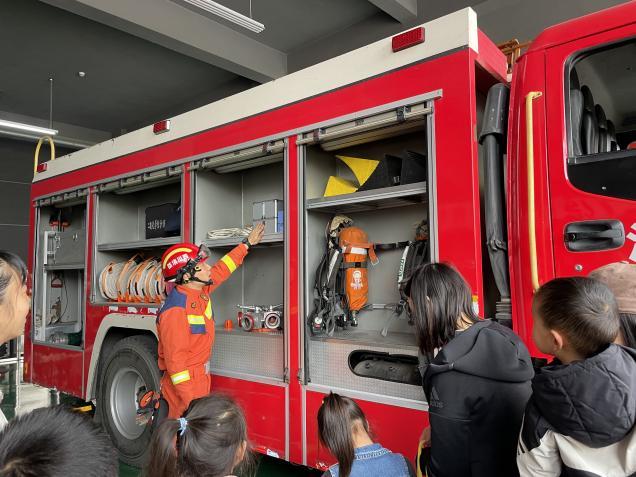 讲座结束后,消防员带领大家参观消防服与各类消防用具,逐一讲解不同装备的功能、使用场景和操作要点,让家长和孩子们直观了解消防救援的专业装备。大家对于消防服装于用具充满极大好奇心,纷纷上手体验:穿戴消防服、使用消防钳等,体验新奇,感受独特。随后,消防员引导大家走近消防车及各类消防常用车辆,打开车厢详细介绍车内的救援器材、灭火设备,耐心解答孩子们的好奇提问,让大家对消防救援工作有了更具象的认知。