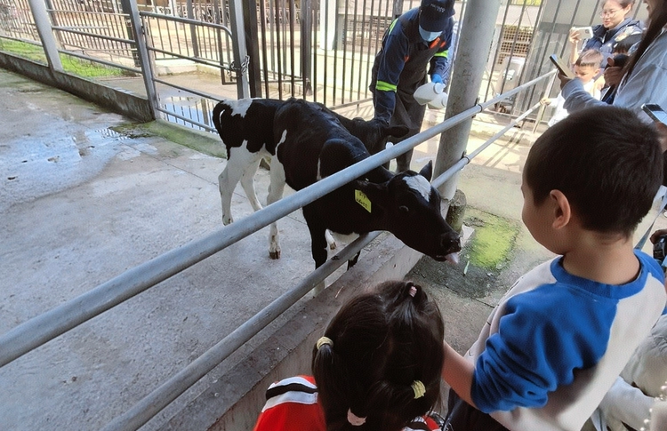 牧场内的景象更让家长们倍感暖心。每一头奶牛都佩戴着专属“身份牌”,清晰标注出生日期、健康信息,实现一牛一档的精细化管理。在犊牛饲养区,出生不到一个月的小奶牛憨态可掬,正大口吮吸着奶瓶,一口气喝完三大瓶奶仍意犹未尽,软萌的模样引得家长和孩子们阵阵欢笑。从奶牛的科学喂养到幼崽的悉心照料,牧场以人性化养殖理念,守护着奶源的天然与纯净,也让家长们对孩子每日饮用的牛奶多了一份安心与认可。