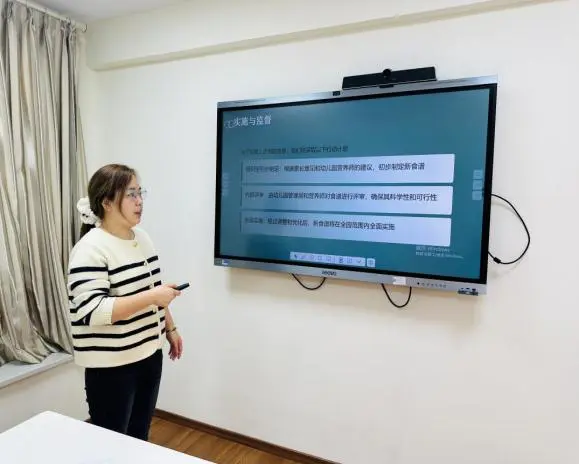 会议最后,园区主任钱老师总结强调园区膳食管理的家园配合工作。她呼吁家长代表参与验菜等膳食体验,了解幼儿餐食加工流程;按时参加月度会议,反馈饮食情况并提出建议;在家培养幼儿良好饮食习惯;关注膳食公示信息,幼儿有特殊饮食需求、过敏情况时及时与老师及膳食委员会沟通,多方携手保障幼儿饮食安全。