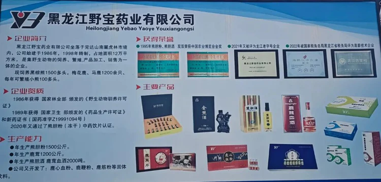 四、黑龙江野宝药业有限公司坐落于虎林市,是大型特种经济动物科研繁育基地,历经三十余年发展,建成亚洲大型黑、棕熊养殖基地之一。主营熊胆系列、鹿系列、特色酒品等产品,其熊胆粉为国家一类中药。企业率先采用无管采胆技术,联合高校科研单位创新研发,坚守品质与诚信经营,斩获多项国家级荣誉,企业负责人也荣获多项行业与社会荣誉。