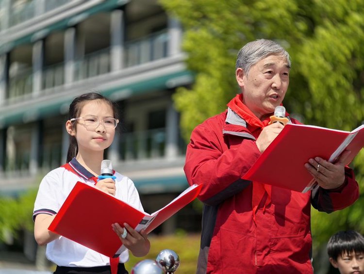 激昂的《运动员进行曲》响彻校园,各班方阵踏着铿锵步伐入场。同学们化身“小红军”,或身着红军主题服饰,或手执鲜红旗帜与长征标语牌,口号嘹亮、精神抖擞,展现附小学子向阳向上的蓬勃朝气!随后的“老少共话长征”环节将活动推向高潮,拱墅区关工委宣讲员王临鹏爷爷与学生代表携手登台,声情并茂讲述长征故事。台下掌声雷动,不少小观众眼中泛起感动的泪光,沉浸式感受红军战士不怕牺牲、团结互助的革命精神。