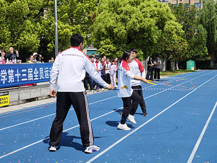 本次运动会的另一大亮点是“校园吉尼斯挑战赛”。学校致竞主理人向全体学子发出倡议,号召大家传承长征“不怕苦、敢拼搏”的奋斗精神,以拼搏姿态挑战自我,奋力刷新校园体育纪录,向校园吉尼斯纪录发起冲击!世界跳绳锦标赛、全国跳绳锦标赛花样跳绳冠军们现场展示花样跳绳,引得全场欢呼,将赛场气氛推向顶点!