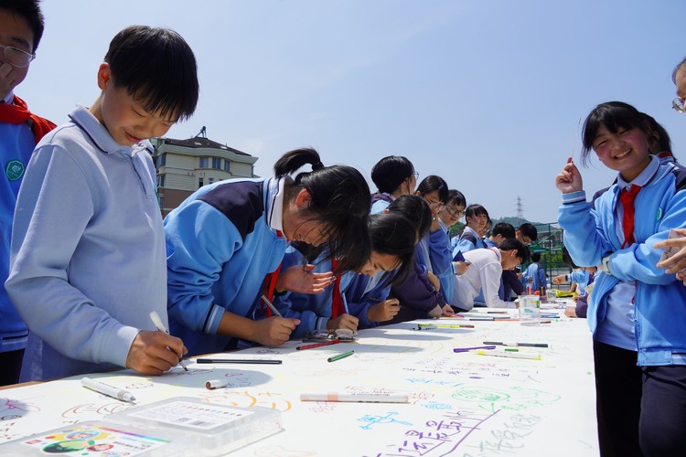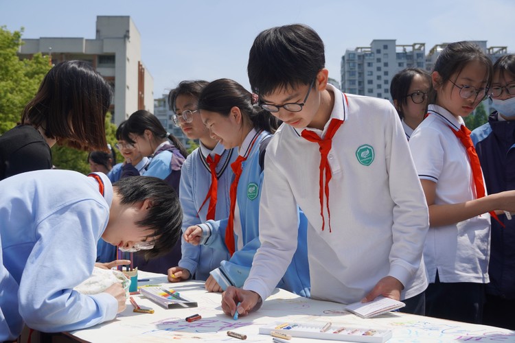 有人用明快的明黄画出满枝盛放的春日花朵,有人用错落的蓝色线条写下对中考的期许,也有人只是借着深浅笔触,晕开一团藏在心底说不出的情绪。长卷慢慢被色彩填满,原本素白的画布渐渐长出了花朵、云朵、星星和各不相同的小小心愿,暖融融的春光落在画布上,也落在每一个轻轻落笔的学生心上,那些攒了许久的心事,都顺着笔端融进了这片柔软的春色里。
