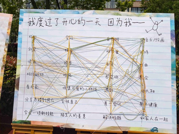 在“畅想美好的一天”区域,学生在志愿者的轻声引导下进行短暂的想象练习,设想自己理想中的放松日子,用一旁的麻绳把这一天的安排串联起来。同学们还在卡片上写下或画出自己的心愿,并将卡片贴在一旁的展板上。