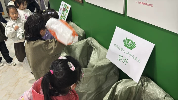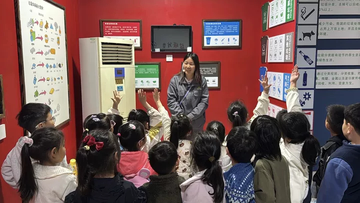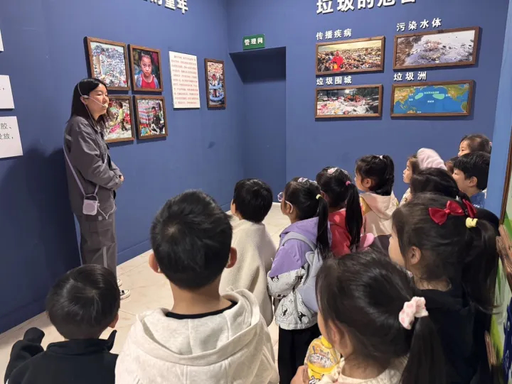 在临平区垃圾分类宣教中心,孩子们开启了一场沉浸式环保学习。在科普展区,孩子们观看了视频学习了垃圾分类的知识,并在讲解员的带领下,通过图文展板了解了垃圾从“投放”到“变废为宝”的全流程,知道了“易腐垃圾可以堆肥,可回收物能再生”的道理。