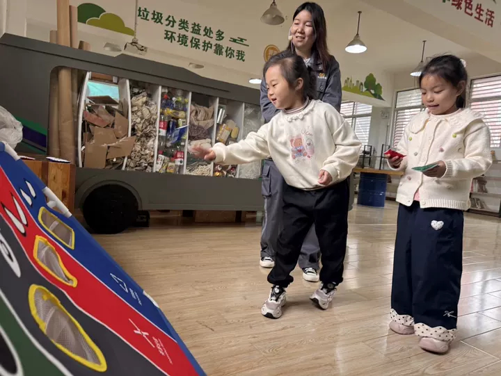 在“分类投准大比拼”游戏中,孩子们手持代表不同垃圾的沙包,争先恐后地将沙包投进对应的模拟垃圾桶,在游戏中巩固了分类知识。活动最后,孩子们还化身“环保宣传员”,向身边的同伴分享自己学到的分类技巧,将绿色理念传递给更多人。