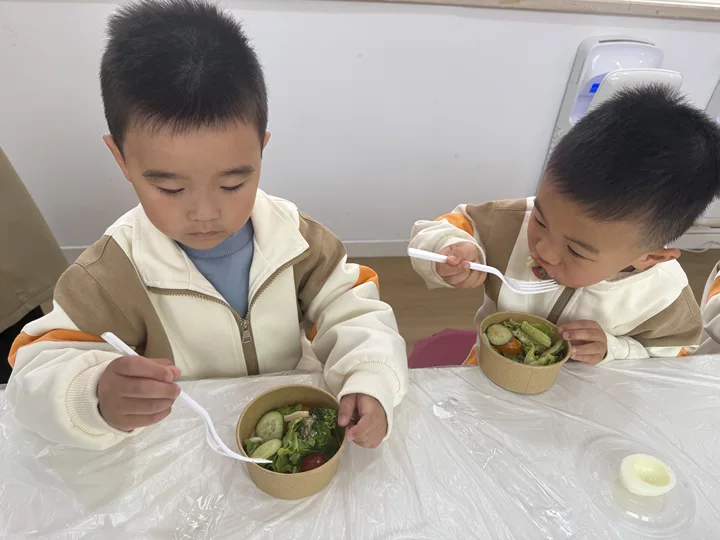 最让孩子们兴奋的是DIY环节:他们用丘比果酱制作果酱酸奶、蔬菜沙拉,在动手操作中感受食材搭配的趣味。