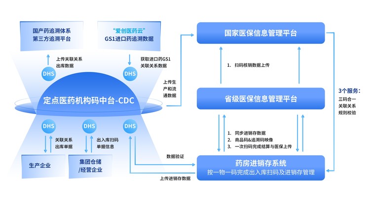 在医保药品耗材追溯信息采集与应用面临诸多挑战的背景下,爱创科技将“码”作为数字化抓手,形成定点医药机构码中台(CDC)整体解决方案,通过统一数据标准、存储和应用,一个平台就可以实现企业自身药品追溯体系/第三方追溯平台数据、GS1进口药追溯及关联数据、生产企业出库及关联数据、集团仓储/经营企业出入库及关联数据的统一管理,通过爱创码中台(CDC)对接国家医保信息管理平台、省级医保信息管理平台,以及药房进销存系统,完成三码合一关联关系规则校验。