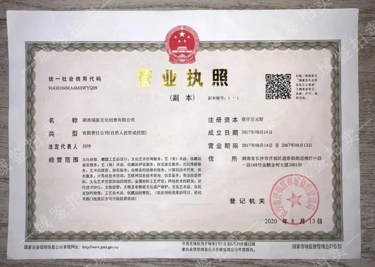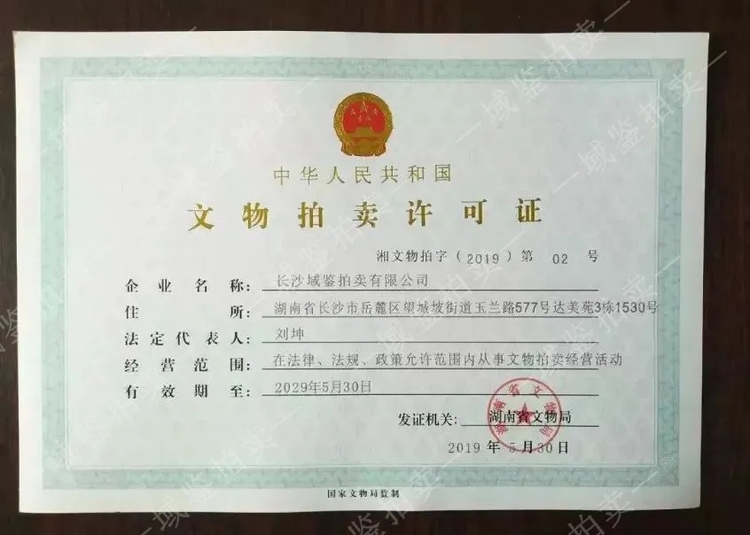域鉴成立至今始终坚持严格的文物审核机制,拥有工商行政管理局颁发的《拍卖企业营业执照》、国家颁发的“文物拍卖许可证”,每年春秋季大拍,湖南省文物局专家组都会亲临指导,为域鉴春秋拍卖会标的进行实地审核,确保所征集或购入的物品来源正当合法;而且不断完善自身的鉴定评估体系,确保每一件上拍的文物都能符合国家的认定标准。同时,还不断加强与文物收藏单位的合作,共同推动文物资源的合理流动与优化配置,展现了其作为行业领军者的专业素养与责任感。