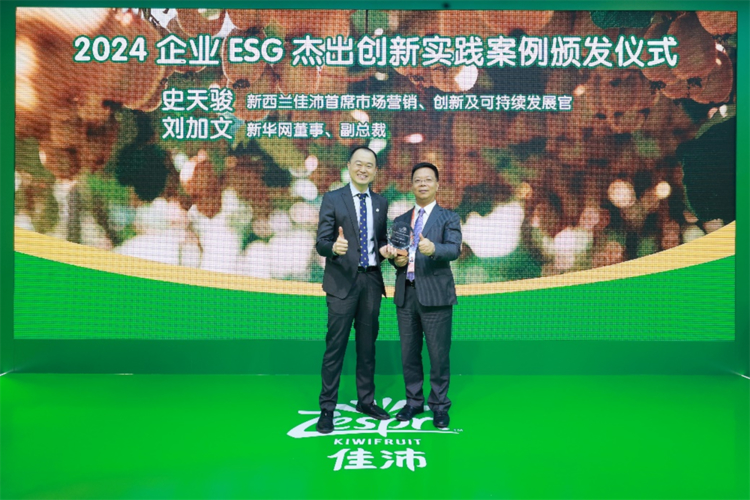 新华网董事、副总裁刘加文为新西兰佳沛首席市场营销创新及可持续发展官Jiunn Shih(史天骏)颁发Zespri佳沛中国“ESG杰出创新实践案例”