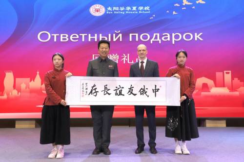 在 “山水相连,情深义重” 主题欢迎仪式上,李显峰校长和李贤德代总领事分别致辞。李贤德代总领事为太阳谷华夏学校准备了一封感谢信,对学校在促进中俄友谊中展现的努力与贡献给予高度认可。学校则回赠一幅书法作品 “中俄友谊长存”,这六个遒劲有力的汉字,象征着中俄两国人民历经风雨的深情厚谊和不断前行的合作未来。