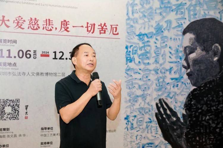 开幕式上,西泠印社社员、深圳书协原副主席兼秘书长陈浩先生也发表了热情洋溢的讲话。他认为卢一书画创作的意义,就是很好地诠释了什么是“守正创新”,而且也非常契合深圳这座城市的精神特质,对卢一书画艺术的未来充满了期待:“我十分看好卢一的未来,尤其是他的作品充分利用了绘画书法与佛教经典多方面艺术元素并进行跨界融合,不但创造了一种全新的艺术形式,更是体现了大爱慈悲。这种融合不仅提升了作品的艺术价值,更让观者在欣赏艺术的同时,感受到了中华文化的深厚底蕴和独特魅力。”我认为卢一创作形式为深圳艺坛注入了新鲜血液,是深圳改革开放四十年书画艺苑绽放出新的艺术奇葩,当然,卢一还很年轻,如果假以时日,将来的创作还有很大的发展空间,前程不可限量。