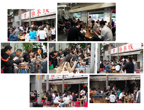 在味道上,提供泡椒、清汤、火锅、滋补、酸菜、番茄等口味,配料方面也是非常丰富,可根据自身喜好添加木耳丝、海带丝、黄花、番茄、午餐肉、虾滑、酥肉等配菜。除此之外,还提供虎皮鸡脚、糍粑油条等特色小吃。不仅满足了消费者的口味还满足了消费者个性化、多元化的需求。