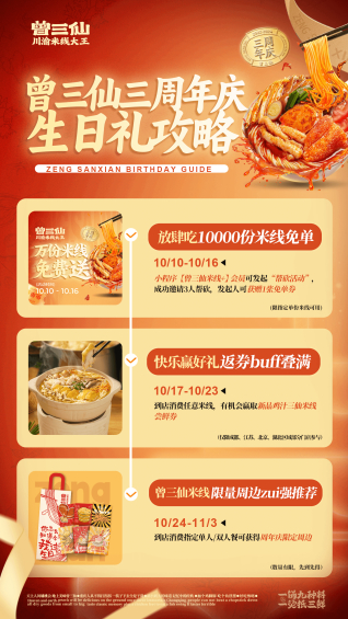 为回馈众多用户的喜爱,曾三仙于今年10月份开启周年庆活动。10月10日开启“万份米线免费送”,会员可发起帮砍活动,成功邀请3人帮砍,发起人可获赠1张免单券,活动期间在用户热情参与下,活动上线不足半日,万份免单券已全部发放;10月17日开启“新品抽奖”活动,到店消费任意米线,可参与新品鸡汁三仙米线优惠券抽奖,共送出17000张新品优惠券,500份新品免单;10月24日开启抖音直播,面向全国用户送出各种周年优惠及周年庆限定周边。三周年活动期间吸引了上万消费者参与,彰显出消费者对品牌的喜爱。