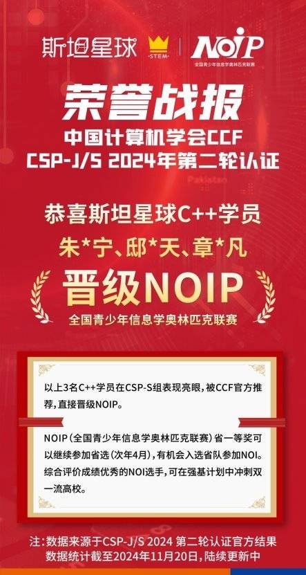近日,NOI 官网公布了 CCF CSP-J/S 2024 第二轮认证评级的分数线和获奖情况,斯坦星球众多 C++ 学员在此次复赛中表现出色,取得了令人瞩目的成绩。