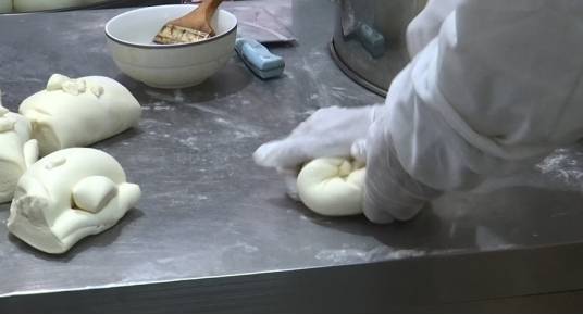养顺馒头坊店长 韦佳:力气大的负责揉面团,妈妈主要做造型,小时候就是一年一年,不知不觉中,跟着妈妈学了各种各式的花饽饽,有小鱼 寿桃 石榴 小燕子等等。