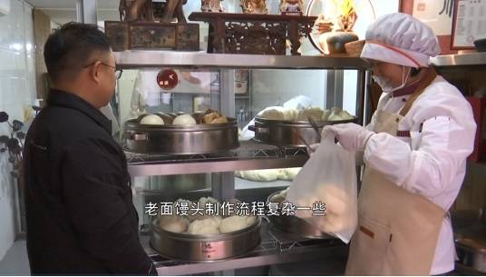 养顺馒头坊店长 韦佳:老面馒头,制作流程复杂一些,要先制作酵子也叫引子,发酵好用矿泉水来和面,再次发酵,发酵好后要称重,手揉成型,实际上真正发酵是三次,时间比较久,只有这样才能激发出麦香味。