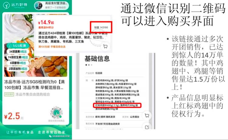 “但此后,我们两方并未建立任何合作。”谢先生说,因此远方好物平台销售的“红标鸡”鸡翅中、鸡腿等产品属于假冒红标鸡产品。他查阅页面信息发现,远方好物销售的假冒“红标鸡”鸡翅中、鸡腿等产品超过1.5万份。