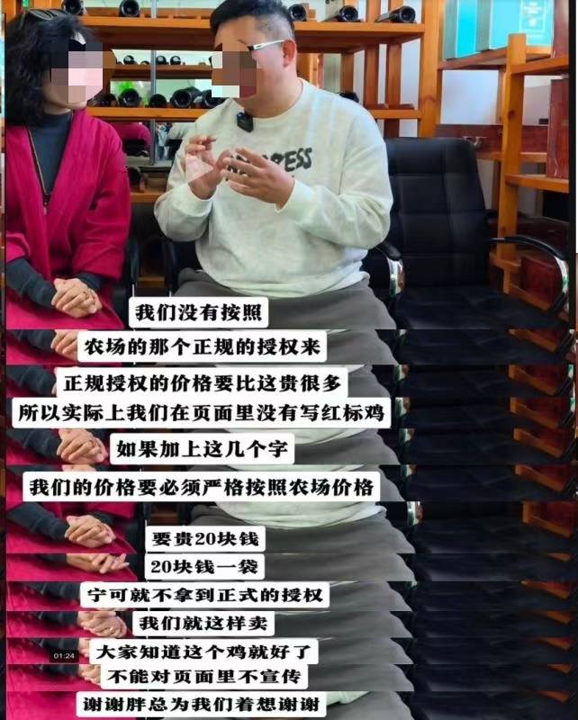 谢先生说,“远方好物明知销售的不是红标鸡产品,却告诉消费者说所售产品未印红标鸡字样,是帮消费者省钱。”谢先生提供的平台截图显示,远方好物冻品总监“小胖”称,“我们在页面里没有写红标鸡,如果写的话,我们必须按照农场的价格销售,这个价格比现在要贵20块钱一袋”“宁可就拿不到正式的授权,我们就这样卖”等。
